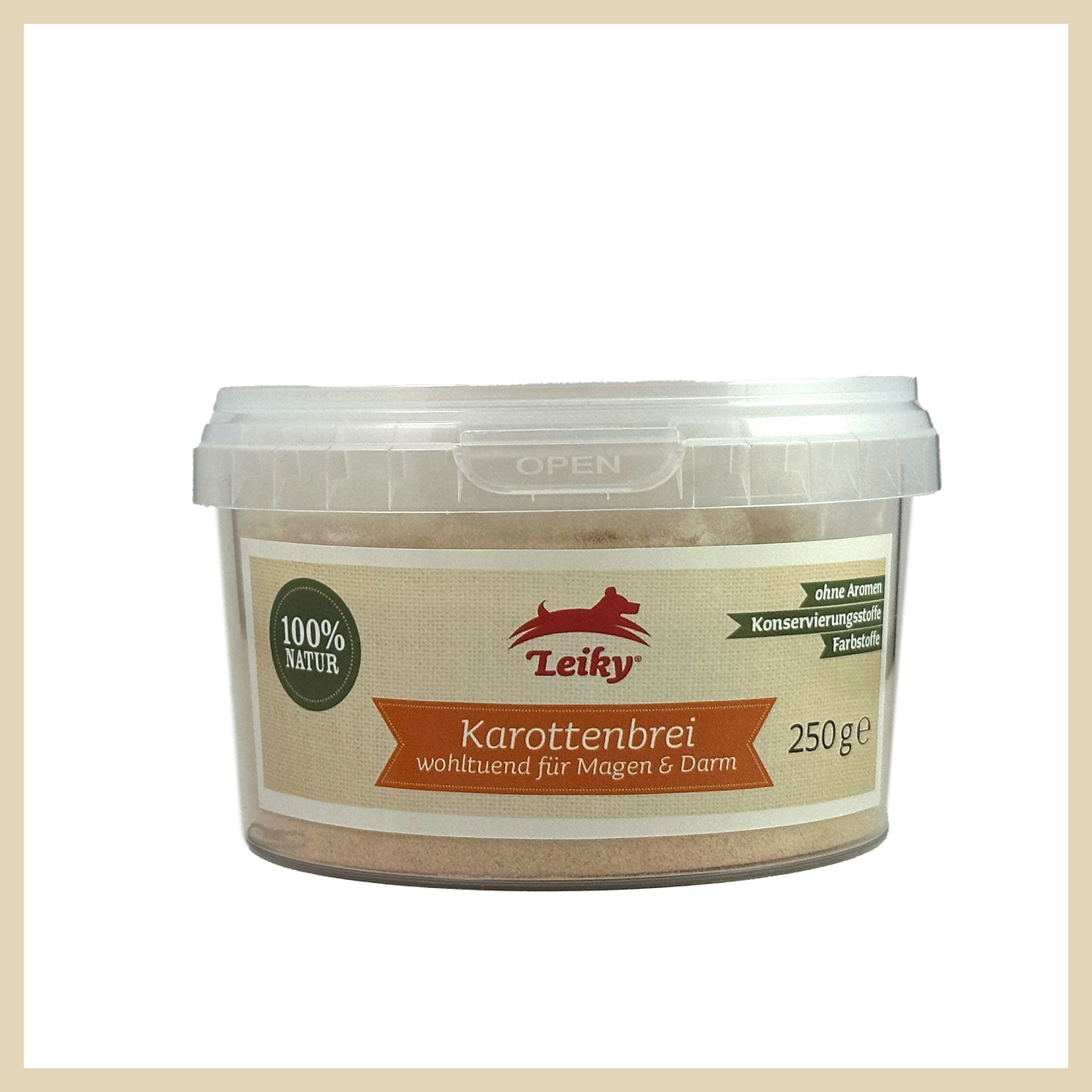 Leiky Karottenbrei mit Apfelpektin kann pur gefüttert werden oder auch dem täglichen Futter (Barf / Nassfutter) als ideale Gemüsebeilage beigemischt werden.