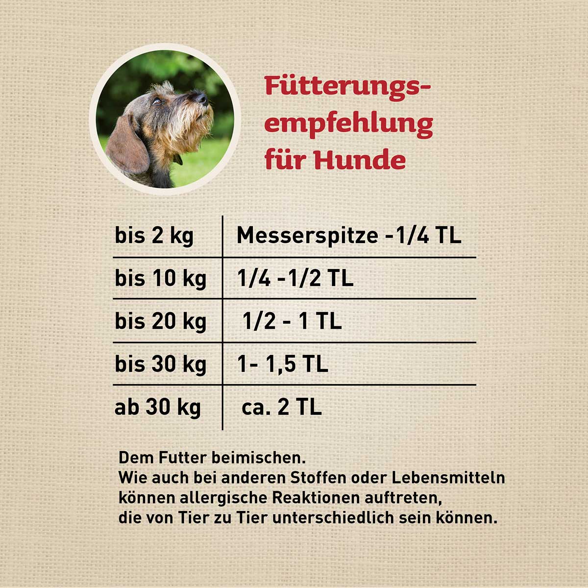z.B. für einen Hund (15-20kg) 0,5 - 1 TL dem Futter beimischen.
