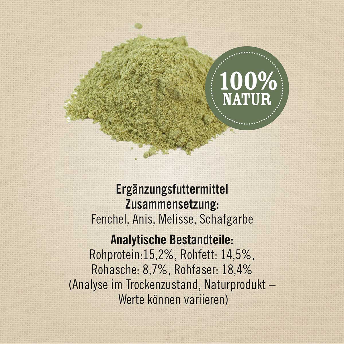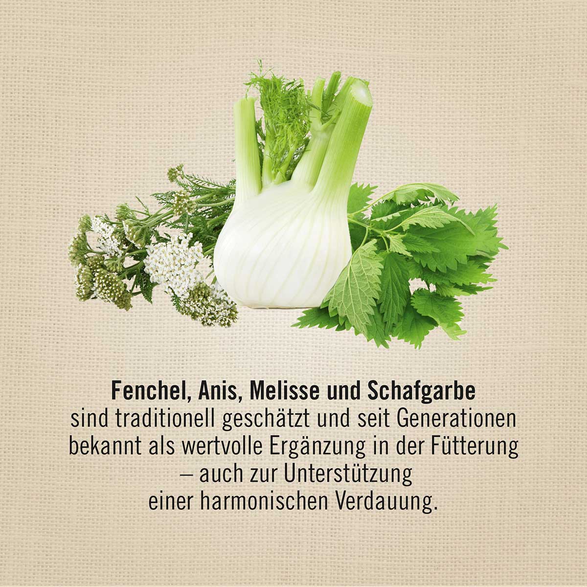 Ausgewählte Kräuter wie Fenchel, Anis, Melisse und Schafgarbe – traditionell geschätzt und seit Generationen bekannt als wertvolle Ergänzung in der Fütterung – auch zur Unterstützung einer harmonischen Verdauung.