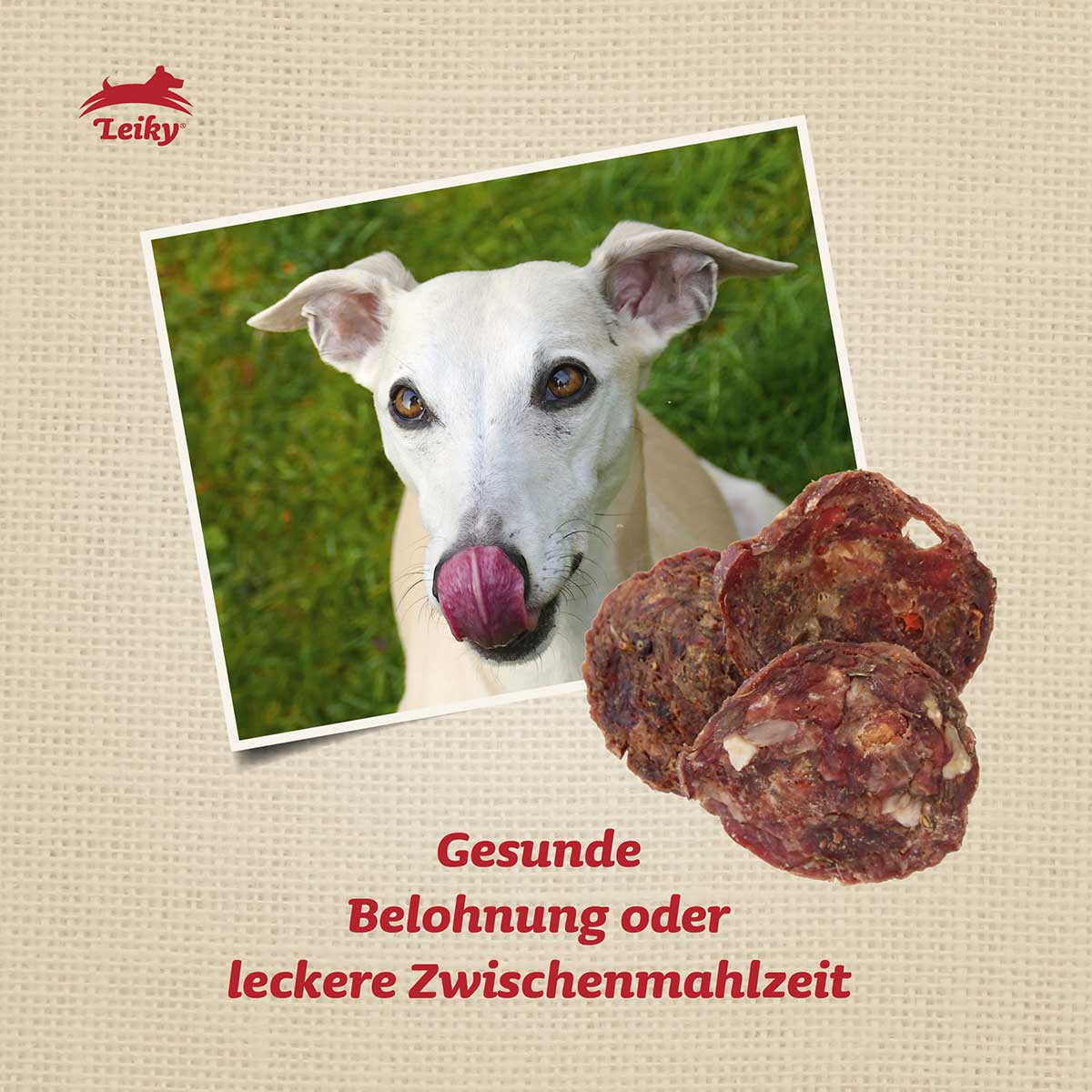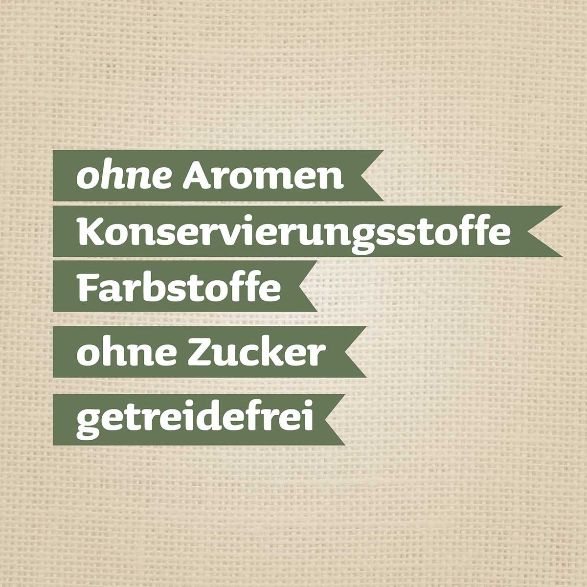 Natürlich ohne Konservierungsstoffe, Farbstoffe, Geschmacksverstärker und getreidefrei, für Hunde jeden Alters und jeder Rasse.