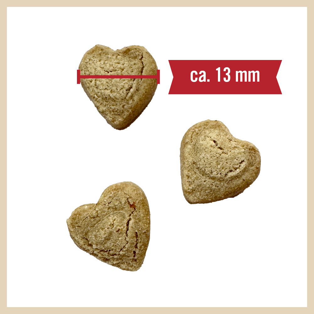 Unsere Herzerl bieten genau das: Sie sind nicht vegetarisch, liefern also weiterhin tierisch wertvolle Proteine bei sehr hoher Schmackhaftigkeit, aber eben in einer gesunden, moderaten Menge. So bleibt der Hund gut versorgt – ohne ihn unnötig zu belasten.