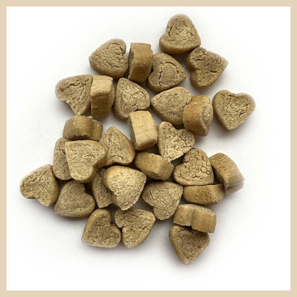 Herzerl enthalten bewusst keinen hohen Fleischanteil. Viele Hauptmahlzeiten für Hunde bestehen aus einem hohen Anteil an Fleisch. Bei der Belohnung zwischendurch darf der Fleischanteil also gerne auch eine weniger wichtige Rolle spielen.