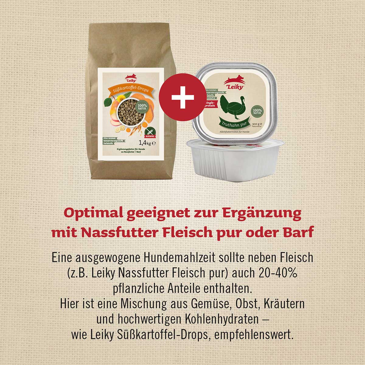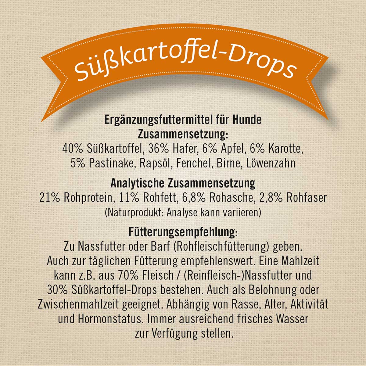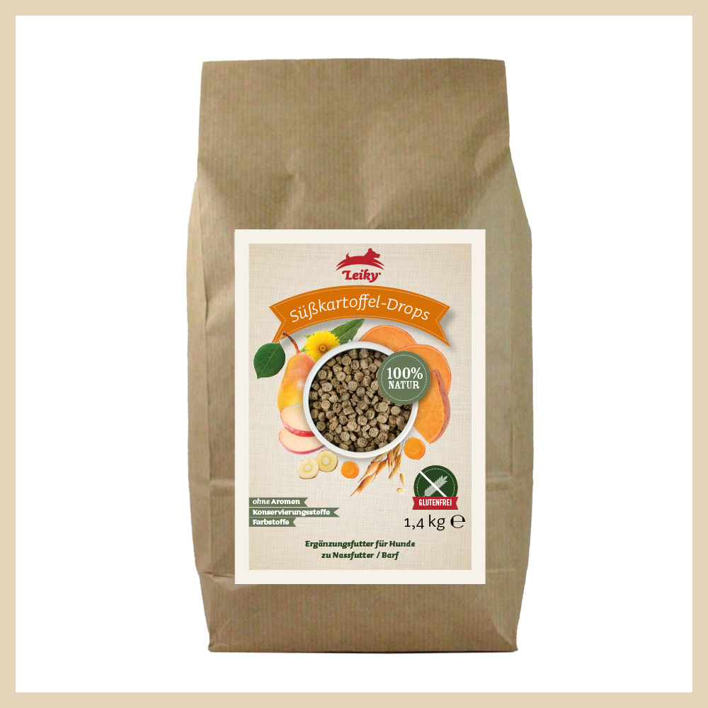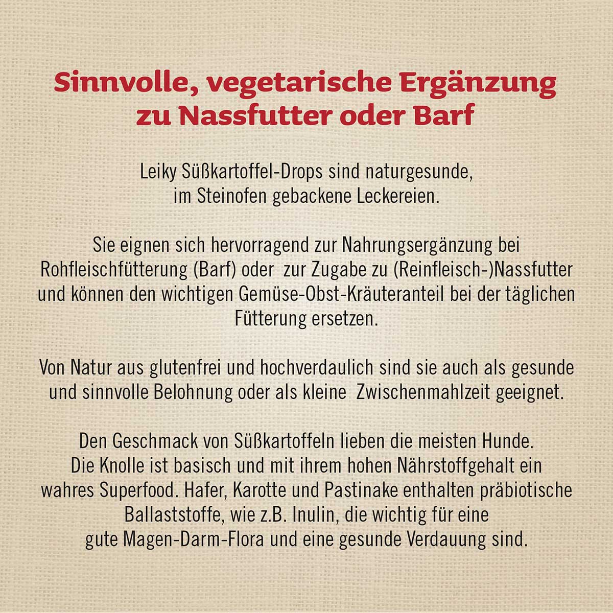 Leiky Süßkartoffel-Drops sind im Steinofen gebackene Leckereien mit Süßkartoffeln, Hafer, Gemüse, Obst und Kräutern.