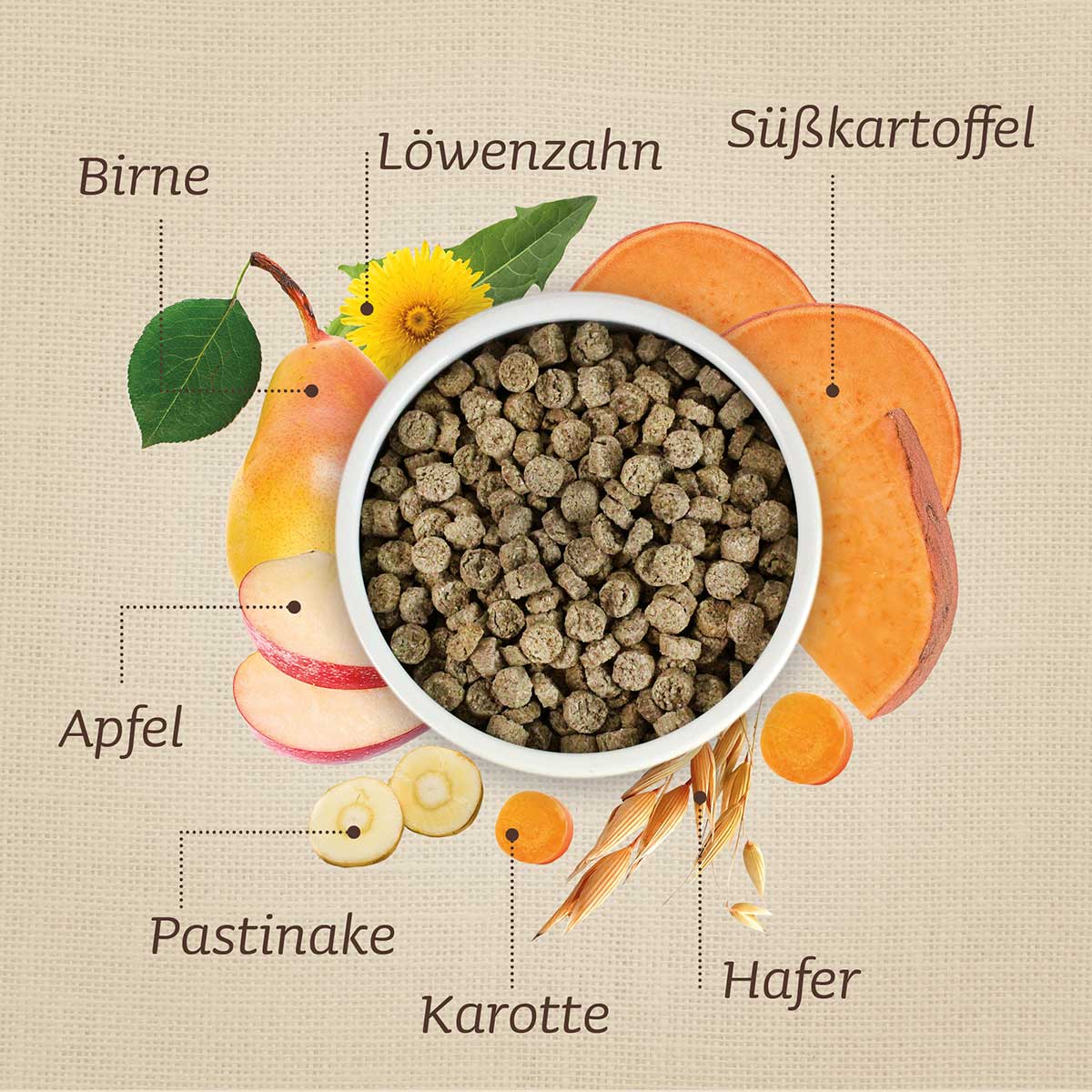 40% Süßkartoffel, 36% Hafer, 6% Apfel, 6% Karotte, 5% Pastinake,