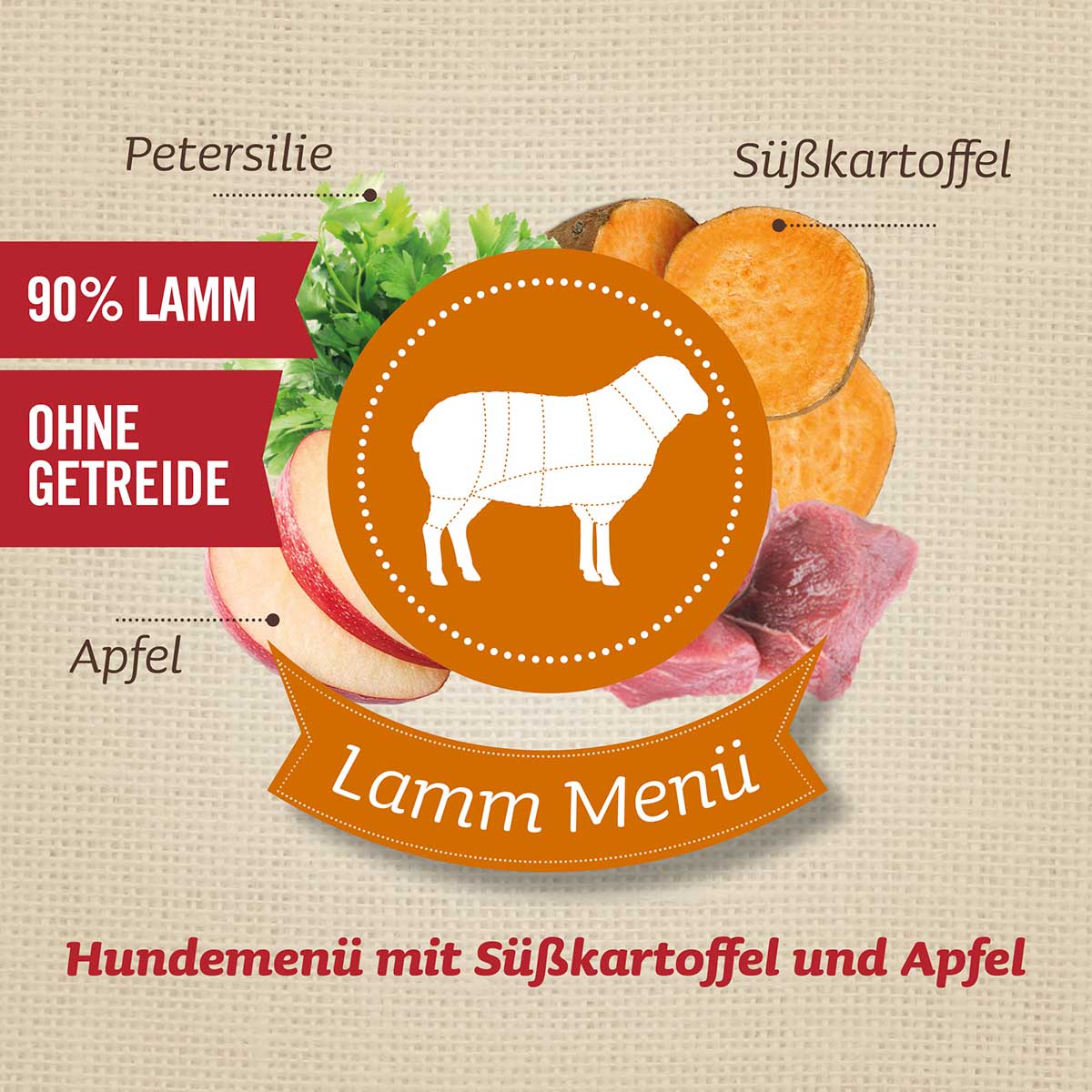Hochwertiges Nassfutter-Menü mit 90% Lamm aus Freilandhaltung, Süßkartoffel und Apfel