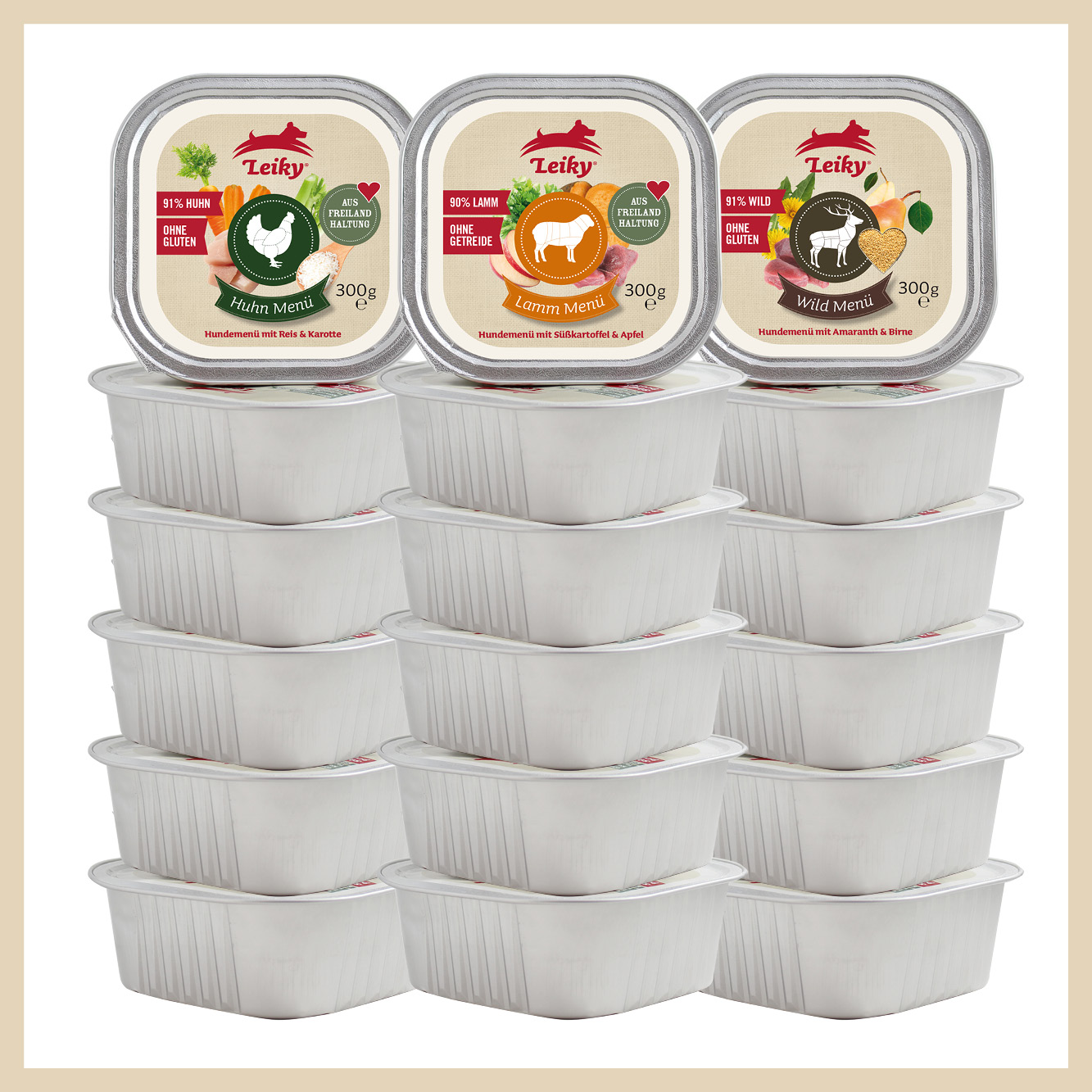 Leiky Nassfutter-Menü Big Pack je 6 x Freiland-Huhn, Wild, Freiland-Lamm