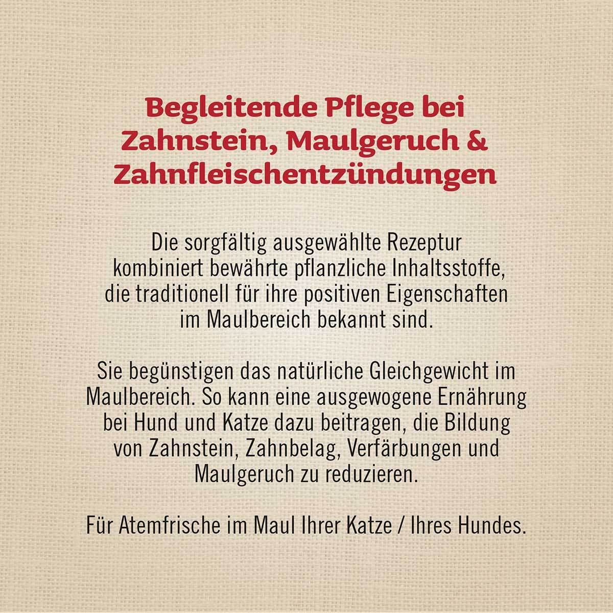 Die sorgfältig ausgewählte Rezeptur kombiniert bewährte pflanzliche Inhaltsstoffe, die traditionell für ihre positiven Eigenschaften im Maulbereich bekannt sind. Sie begünstigen das natürliche Gleichgewicht im Maulbereich. So kann eine ausgewogene Ernährung bei Hund und Katze dazu beitragen, die Bildung von Zahnstein, Zahnbelag, Verfärbungen und Maulgeruch zu reduzieren und die Zähne zu reinigen – für saubere und gepflegte Zähne.