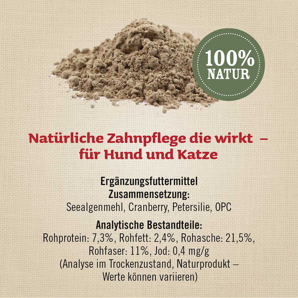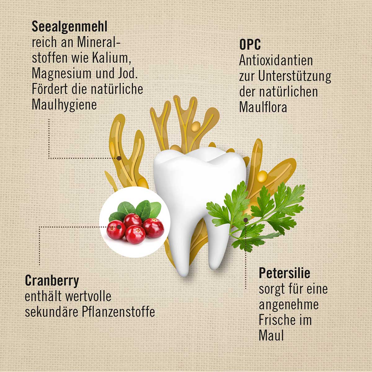 Im Mittelpunkt steht Seealgenmehl – reich an Mineralstoffen wie Kalium, Magnesium und Jod. Es wird seit Langem als wertvolle Zutat in der Fütterung eingesetzt. Ergänzt wird Dentanol durch OPC aus Traubenkernen. Hinzu kommen Cranberries mit ihren sekundären Pflanzenstoffen. Petersilie sorgt für eine angenehme Frische im Maul.