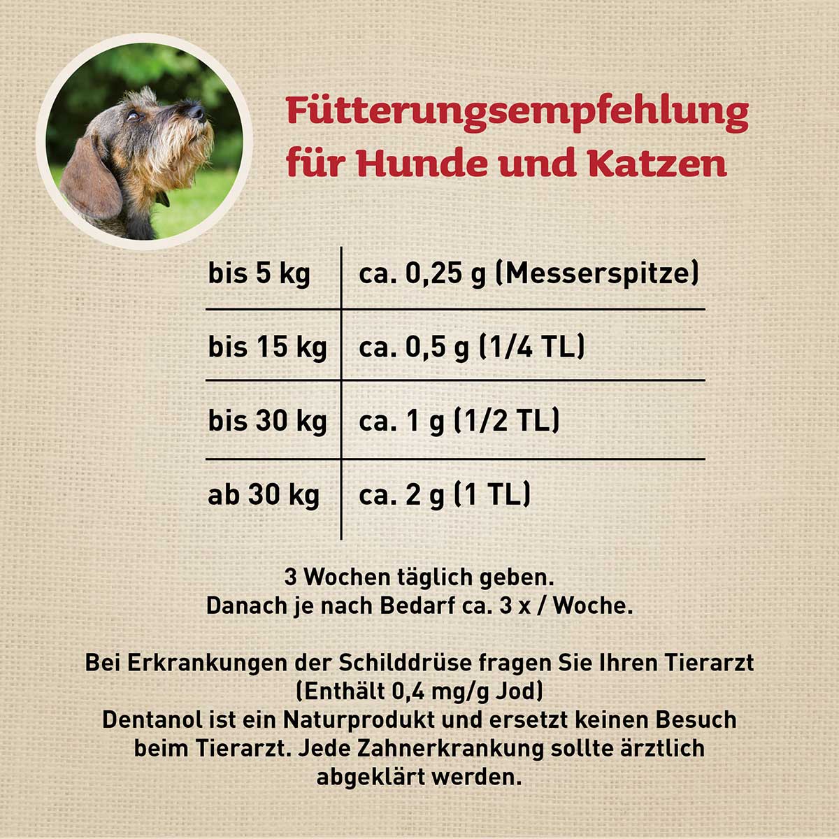 5 - 15 kg Hund ca. 0,5 g (1/4 TL) / 15 - 30 kg Hund ca. 1 g (1/2 TL)