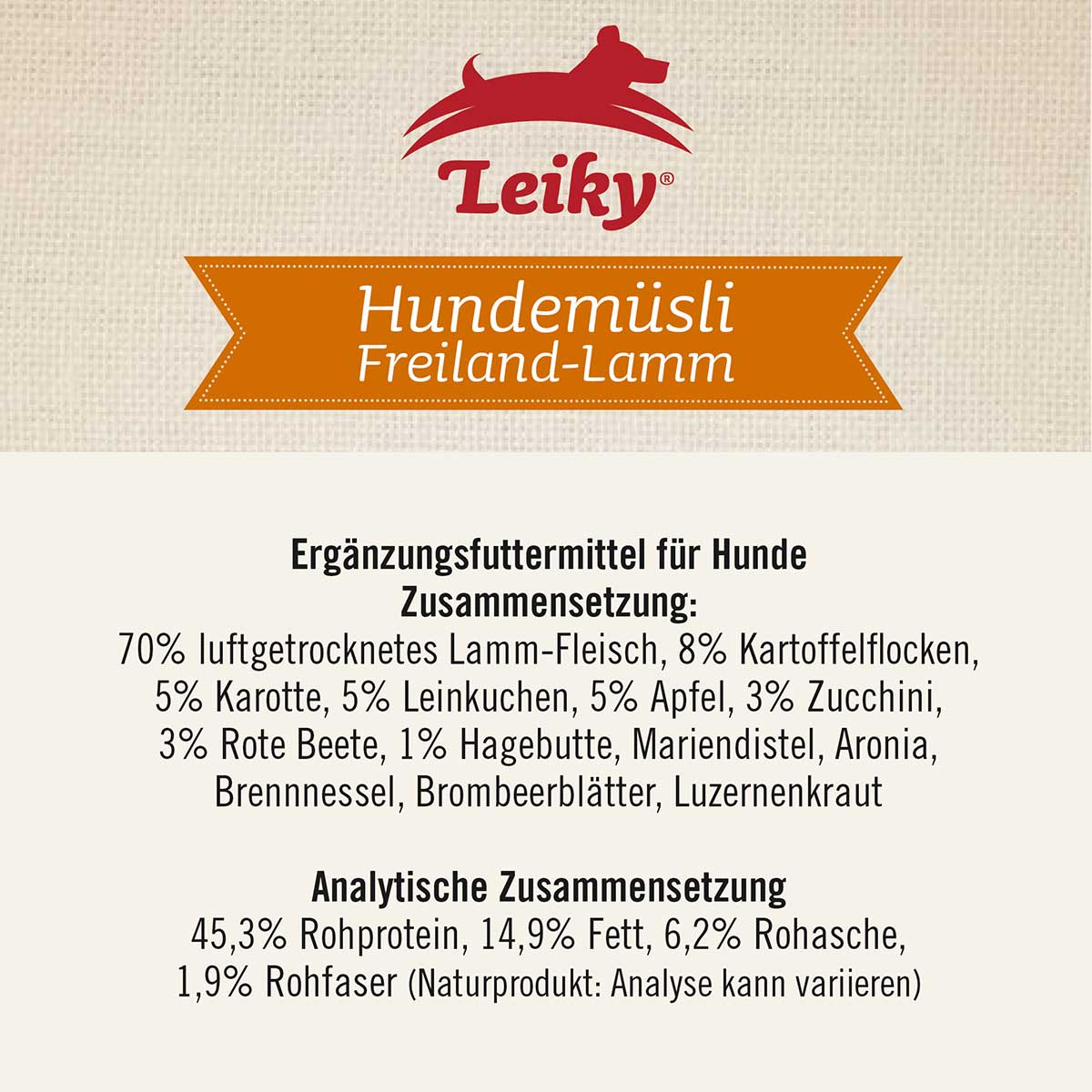 Leiky Hundemüsli ist ein artgerechtes, natürliches und hochwertiges Futter aus 70% luftgetrocknetem Lammfleisch aus Freilandhaltung und 30% getrocknetem Gemüse, wertvollem Leinkuchen und Kräutern, sorgsam nach ernährungsphysiologischer Wertigkeit ausgesucht. Einfach mit Wasser auffüllen, ca. 10-15 Minuten