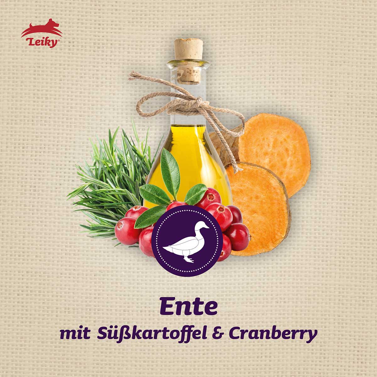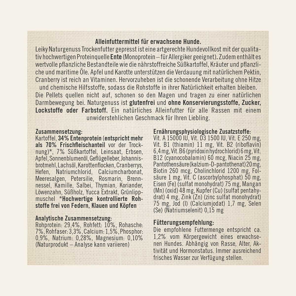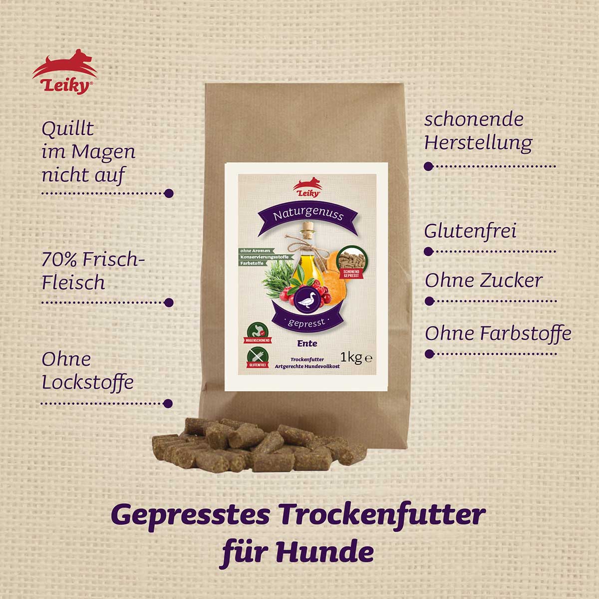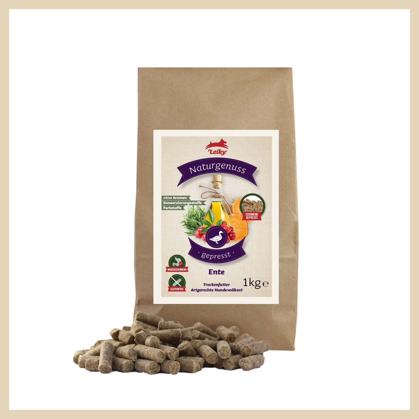 Leiky Naturgenuss Trockenfutter gepresst ist eine artgerechte Hundevollkost mit der qualitativ hochwertigen Proteinquelle Ente (Monoprotein – für Allergiker geeignet). Zudem enthält es wertvolle pflanzliche Bestandteile wie die nährstoffreiche Süßkartoffel, Kräuter und pflanzliche und maritime Öle. Apfel und Karotte unterstützen die Verdauung mit natürlichem Pektin, Cranberry ist reich an Vitaminen. Hervorzuheben ist die schonende Verarbeitung ohne Hitze und chemische Hilfsstoffe, sodass die Rohstoffe in ihrer Natürlichkeit erhalten bleiben.