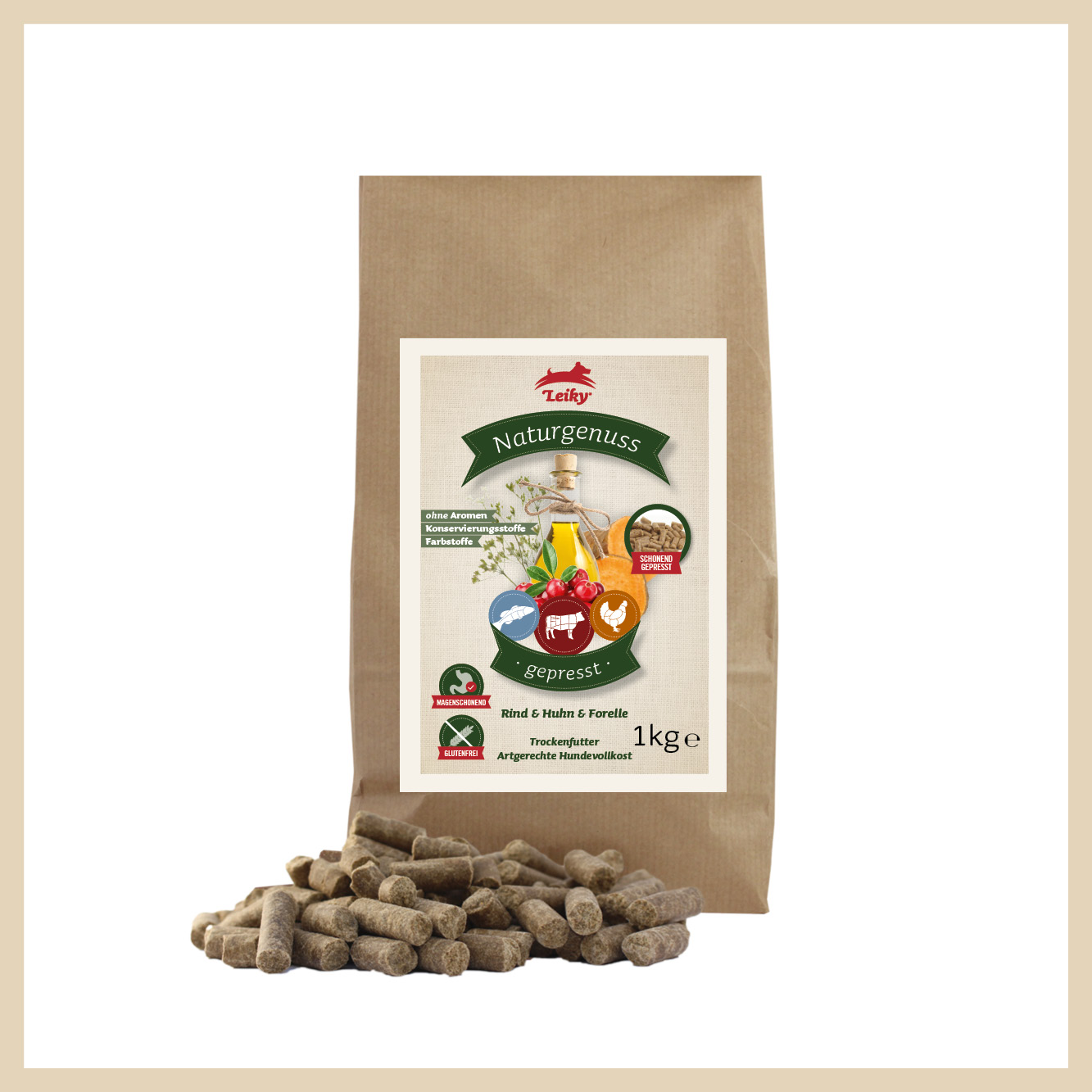 Naturgenuss Trockenfutter gepresst ist eine artgerechte Hundevollkost mit drei qualitativ