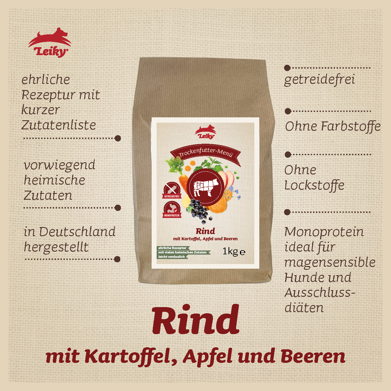 Das Leiky Trockenfutter Rind-Menü ist ein hochwertiges Alleinfuttermittel für Hunde, das bewusst auf das Wesentliche reduziert ist. Mit Rind als einziger tierischer Proteinquelle (Monoprotein) eignet es sich ideal für magensensible Hunde, Hunde mit Futtermittelunverträglichkeiten sowie für Ausschlussdiäten.